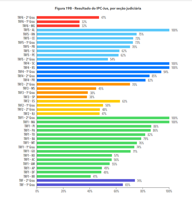 Desde quando foi instituído, em 2014, a JFAL apresentou aproveitamento de 100% em sete anos (2016, 2017, 2018, 2020, 2021, 2022 e, agora, 2023). De acordo com o documento do CNJ, no âmbito da 5ª Região, seguem a JFAL no índice de produtividade a JFRN, com 75%; a JFCE, com 73% no IPC-Jus; a JFPB, com 70% e, juntas, com 62% de produtividade, a JFSE e a JFPE.