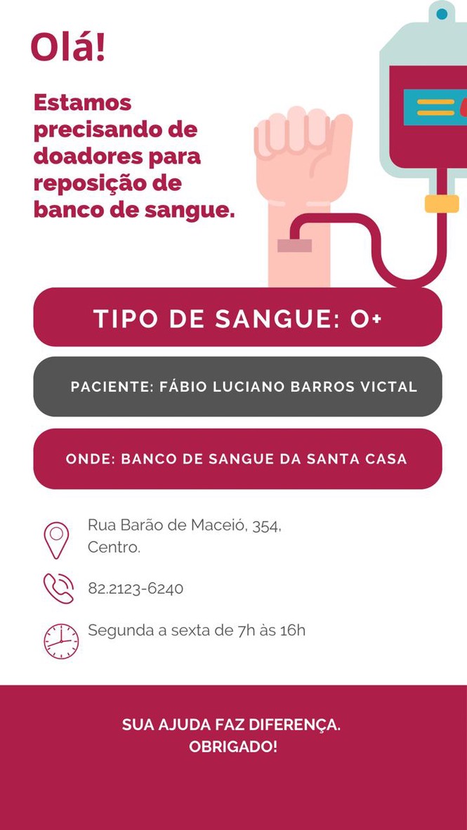 O servidor Fábio Luciano Barros Victal, da 13ª Vara da Justiça Federal em Alagoas (JFAL), está hospitalizado para tratamento de saúde e precisa de doação de sangue. Quem puder ajudar, devo comparecer ao Banco de Sangue da Santa Casa de Maceió, de segunda a sexta-feira, das 7h às 16h.