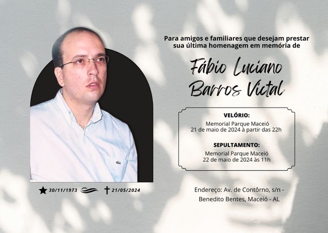 Com profundo pesar e consternação, informamos, nesta terça-feira, 21, o falecimento do servidor Fábio Luciano Barros Victal, lotado na 13ª Vara da Justiça Federal em Alagoas.