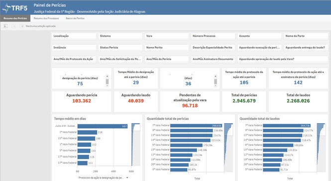 Três novos paineis desenvolvidos pelo Comitê BI (Business Intelligence) da Justiça Federal em Alagoas (JFAL) já estão disponíveis para uso em toda a 5ª Região. Cada uma das ferramentas contém informações de forma isolada sobre audiências, perícias e Requisições de Pequeno Valor (RPVs) e estão inseridas nos sistemas PJe 2.x e Creta. Entre as atualizações e melhorias das ferramentas, os desenvolvedores pontuam gestão mais ágil, detalhada e confiável.