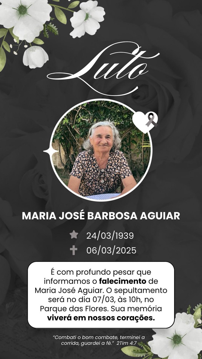 Com profundo pesar, informamos o falecimento da sra. Maria José Aguiar, ocorrido nesta quinta-feira, 6 de março. Ela é mãe do servidor Inaldo Barbosa, do Centro Judiciário de Solução de Conflitos e Cidadania (Cejusc) da JFAL.