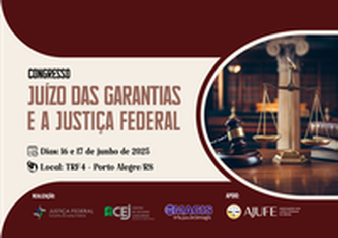 Estão abertas, até 2 de junho, as inscrições para o I Congresso Juízo das Garantias e a Justiça Federal, que acontecerá presencialmente em 16 e 17 de junho, na sede do Tribunal Regional Federal da 4ª Região (TRF4), em Porto Alegre (RS). O evento é uma realização do Centro de Estudos Judiciários do Conselho da Justiça Federal (CEJ/CJF), em parceria com a Escola de Magistrados e Servidores do TRF4 (Emagis), e conta com o apoio da Associação dos Juízes Federais (Ajufe). As inscrições podem ser feitas no formulário eletrônico disponível no Portal do CJF.
