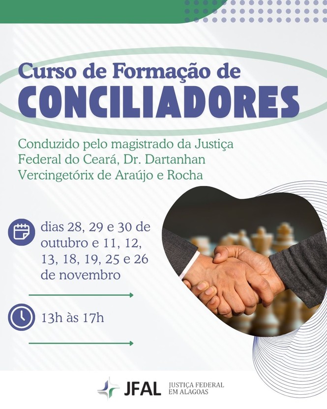A Justiça Federal em Alagoas (JFAL) promove nos dias 28, 29 e 30 de outubro e 11, 12, 13, 18, 19, 25 e 26 de novembro, o curso de Formação de Conciliadores para servidores da instituição, com vagas limitadas. As aulas serão ministradas pelo magistrado da Justiça Federal do Ceará, Dartanhan Vercingetórix de Araújo e Rocha no horário das 13h às 17h, com carga total de 40 horas. As aulas serão conduzidas via plataforma Zoom. No entanto, os participantes devem comparecer de forma presencial em suas respectivas Seções Judiciárias.