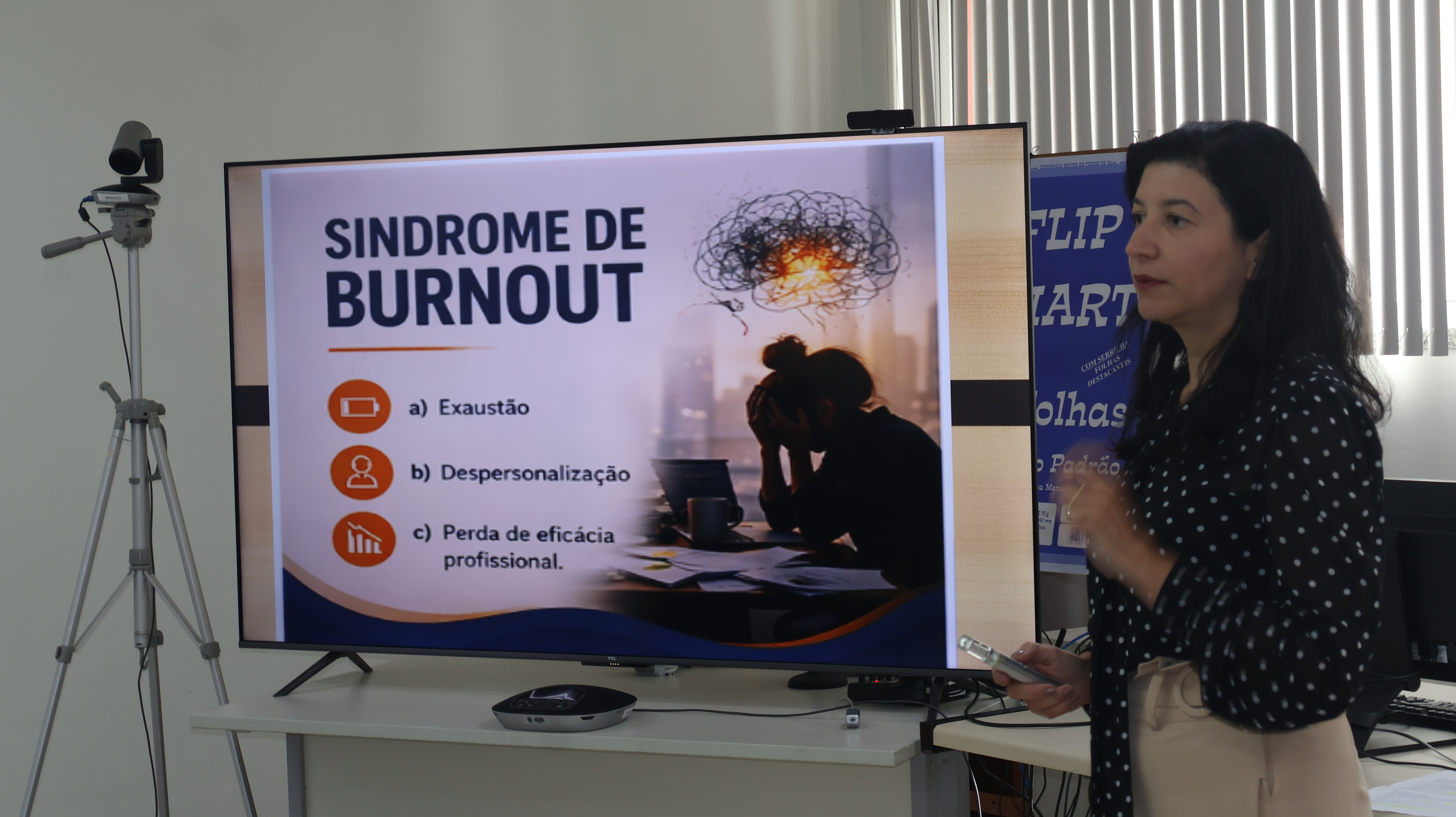 A médica Andreia Souto, do Espaço Saúde da JFAL, conversou com o público a respeito da Síndrome de Burnout. “Observamos cada vez mais o aumento do índice de afastamento do trabalho para tratamento da saúde por doenças mentais. É um estresse crônico, decorrente de um trabalho que não foi gerenciado de forma adequada. Por isso, a importância de entendermos que há a necessidade de um gerenciamento dos fatores de riscos psicossociais, que são fatores de adoecimento mental no ambiente de trabalho”, resume a médica.